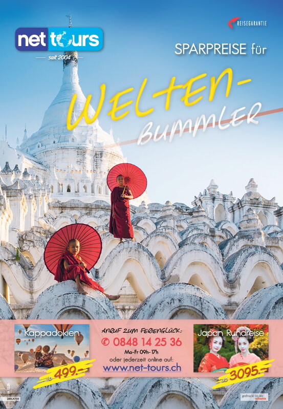 Jordanien Rundreise 11 Reisetage mit Rundreise und Entspannung am Roten Meer Alle im Programm erwähnten Besichtigungen inkl. allen Eintrittsgebühren 1 Nacht im komfortablen Beduinencamp im Nationalpark Wadi Rum Begleitet von lokaler Deutsch sprechender Reiseleitung Halbpension während der gesamten Reise Sämtliche Transfers inklusive Übernachtungen in 4★ Hotels sowie 1 Übernachtung im Beduinencamp 23kg Gepäck Alle im Programm erwähnten Besichtigungen inkl. allen Eintrittsgebühren Flug ab/bis Zürich Entspannung am Strand des roten Meers Rundreise ab CHF 1’995.- Reisedetails anschauen Java Bali Rundreise 10 Reisetage von Java nach Bali Magische Welten zwischen Vulkanen und Göttern Fahrten im Panoramazug & « Whoosh » Highspeed train Begleitet von lokaler Deutsch sprechender Reiseleitung Tägliches Frühstück inbegriffen Rundreise im klimatisierten Reisebus 7 Übernachtungen in 4* Hotels 23kg Gepäck Ausflüge gemäss Reiseprogramm inbegriffen Flüge ab/bis Zürich Verlängerung möglich am Strand von Sanur oder Legian Eintrittsgelder bereits inbegriffen Rundreise ab CHF 1’995.- Reisedetails anschauen Slowenien 6 Reisetage inkl. Frühstück Standorthotel in Ljubljana Inkl. Postojna-Höhle, Bled-Schloss & Predjama Burg Begleitet von lokaler Deutsch sprechender Reiseleitung tägliches Frühstück, 1 Mittagessen am 4. Tag Ausflüge im klimatisierten Reisebus 5 Übernachtungen im guten Mittelklasshotel 23kg Gepäck Ausflüge gemäss Reiseprogramm inbegriffen Flüge mit SWISS Rundreise ab CHF 995.- Reisedetails anschauen Island & Norwegen - Majestic Princess Reise vom 15.06. – 29.06.2026 Flüge ab/bis Zürich Spektakuläre Nordroute – Fjorde & Feuer-Eis-Highlights Englisch sprechendes Bordpersonal Kreuzfahrt an Bord der Majestic Princess Vollpension an Bord 14 Nächte in der gebuchten Kabinenkategorie Flug ab/bis Zürich bereits inbegriffen Kreuzfahrt ab CHF 1’995.- Reisedetails anschauen Kappadokien 8 Reisetage inkl.Halbpension Flug ab/bis Zürich Profitieren Sie von unglaublichen Aktionspreisen Deutsch sprechende lokale Reiseleitung Halbpension Rundreise im klimatisierten Reisebus 7 Übernachtungen in 4-Sterne Hotels 20kg Gepäck All Inclusive während der Verlängerungswoche Ausflüge gemäss Reiseprogramm inbegriffen Flug ab/bis Zürich Verlängern Sie Ihre Reise an der türkischen Riviera Eintrittsgelder bereits inbegriffen Rundreise ab CHF 499.- Reisedetails anschauen Kalabrien 8 Reisetage inkl. Halbpension Direktflüge ab/bis Zürich mit Swiss Küsten, Kultur & Genuss Begleitet von lokaler Deutsch sprechender Reiseleitung Halbpension Rundreise im modernen Reisebus 7 Übernachtungen im 4★ Hotel Ausflüge gemäss Reiseprogramm inbegriffen Flüge mit SWISS Eintrittsgelder bereits inbegriffen Rundreise ab CHF 1’595.- Reisedetails anschauen Andalusien Rundreise 8 Reisetage inkl. Halbpension Flüge mit SWISS von Zürich Rundreise in der Heimat des Flamenco Begleitet von lokaler Deutsch sprechender Reiseleitung Halbpension Rundreise im modernen Reisebus 7 Übernachtungen in guten Mittelklasshotels 23kg Gepäck Ausflüge gemäss Reiseprogramm inbegriffen Flüge mit SWISS Eintrittsgelder bereits inbegriffen Rundreise ab CHF 1’545.- Reisedetails anschauen Amalfiküste & der Golf von Neapel 8 Reisetage inkl. Halbpension Direktflüge ab/bis Zürich mit Swiss Küsten, Städte & Geschichte Begleitet von lokaler Deutsch sprechender Reiseleitung Halbpension Rundreise im modernen Reisebus 7 Übernachtungen im 4★ Hotel Ausflüge gemäss Reiseprogramm inbegriffen Flüge mit SWISS Eintrittsgelder bereits inbegriffen Rundreise ab CHF 1’845.- Reisedetails anschauen NCL Spirit - Panamakanal Reise vom 23.04. – 13.05.2026 Durchfahrt Panamakanal 2 Nächte in Miami Erstklassige Betreuung durch professionelles Bordpersonal Kreuzfahrt an Bord der NCL Spirit Vollpension an Bord 18 Nächte in der gebuchten Kabinenkategorie Flug ab/bis Zürich bereits inbegriffen Kreuzfahrt ab CHF 2’995.- Reisedetails anschauen Polen Rundreise 8 Reisetage inkl. Frühstück Flüge mit SWISS von Zürich Zeitreise durch das reiche UNESCO-Weltkulturerbe Begleitet von lokaler Deutsch sprechender Reiseleitung tägliches Frühstück inkl. Rundreise im modernen Reisebus 7 Übernachtungen in guten Mittelklasshotels 23kg Gepäck Ausflüge gemäss Reiseprogramm inbegriffen Flüge mit SWISS Eintrittsgelder bereits inbegriffen Rundreise ab CHF 1’445.- Reisedetails anschauen Katalog anschauen Online-Katalog anschauen Italien Reisen Italien Reisen Newsletter Newsletter abonnieren Promos Angebote zeigen Angebote sortieren Standard Preis aufsteigend Preis absteigend Aktuellste zuerst Aktuellste zuletzt Angebote filtern Badeferien Kreuzfahrt Rundreise Spezialreisen Lastminute Regionen Südsee Europa Asien Afrika / Naher Osten / Indischer Ozean Europa Mittelmeer Europa Norden Karibik Nord- und Südamerika Transatlantik Weltreise Unsere Angebote ab CHF 1’545.- Montenegro Rundreise 8 Reisetage inkl. Frühstück Eintritt Nationalpark Biogradska Gora und Nationalpark Skutari-See Inkl. Stari Bar, Ulcinj, Cetinje, Kotor uvm. Begleitet von lokaler Deutsch sprechender Reiseleitung Frühstück Rundreise im modernen Reisebus 7 Übernachtungen in guten Mittelklasshotels 23kg Gepäck Ausflüge gemäss Reiseprogramm inbegriffen Flüge ab/bis Zürich Eintrittsgelder bereits inbegriffen Details ab CHF 1’695.- Baskenland Rundreise 8 Reisetage inkl. Halbpension Flüge von Zürich Inkl. Weinkostproben in La Rioja und Burgos Begleitet von lokaler Deutsch sprechender Reiseleitung Halbpension Rundreise im modernen Reisebus 7 Übernachtungen in guten Mittelklasshotels 23kg Gepäck Ausflüge gemäss Reiseprogramm inbegriffen Flüge mit SWISS Eintrittsgelder bereits inbegriffen Details ab CHF 1’795.- Kroatien Inselhüpfen 9 Reisetage inkl. Halbpension mit 1 Hotelnacht in Split 3-Gänge Menüs, Kapitänsdinner & 3 Ausflüge inklusiv Tourmanager an Bord (Englisch) Halbpension Alle Transfers vor Ort 7 Übernachtungen an Bord der MS Drea