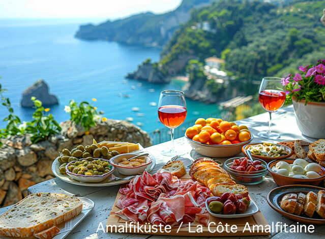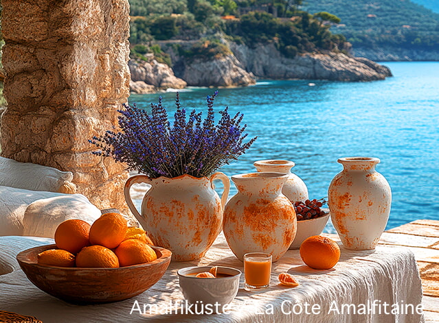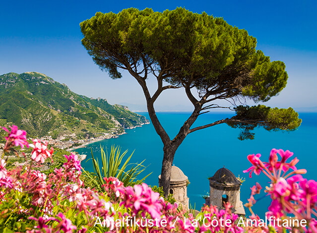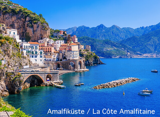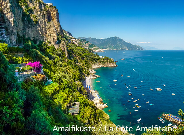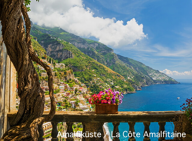Découvrez la magie de la côte Amalfitaine, la perle du sud de l‘Italie, où des falaises escarpées plongent dans des criques azurées et où flotte dans l’air le parfum frais des citrons. La côte entre Positano et Vietri est protégée par l‘UNESCO et enchante par ses paysages dignes d‘un livre d‘images, ses vestiges antiques et sa « Dolce Vita » dans toute sa splendeur colorée.
