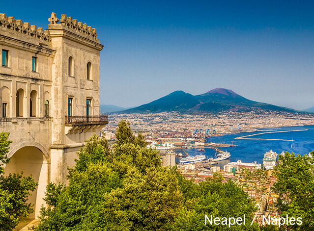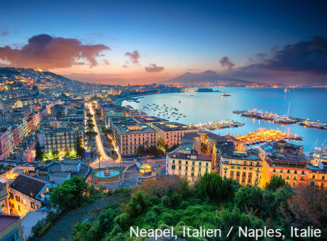 Tour de ville dans la Naples monumentale. La forteresse médiévale Castel Nuovo domine majestueusement le port, tandis que le célèbre Teatro San Carlo, le plus ancien opéra encore en activité en Europe, impressionne par sa splendeur baroque. Plongez au coeur de la ville dans les « Quartiers Espagnols » – un labyrinthe de ruelles étroites, de linge flottant au vent et de tavernes authentiques. Visite du somptueux palais royal, déjeuner individuel et promenade dans le quartier historique de Spaccanapoli, l‘âme de la vieille ville de Naples. Dans la chapelle Sansevero, vous admirez le célèbre « Cristo Velato » avec son voile de marbre qui semble transparent – un chef-d‘oeuvre baroque, sculpté d‘une main de maître !