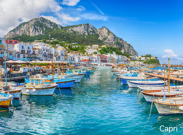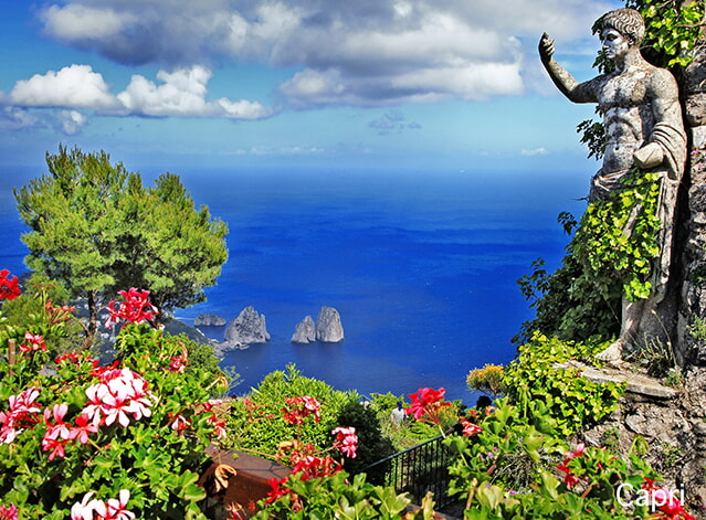 Excursion d‘une journée en hors-bord vers l‘île de Capri. Trajet panoramique vers les hauteurs d’Anacapri, suivi d’une promenade à travers les jardins colorés d’Auguste, offrant une vue à couper le souffle sur les célèbres rochers Faraglioni. Ensuite, temps libre pour profiter de « La Dolce Vita » sur la célèbre Piazzetta – le coeur de l‘île de Capri.