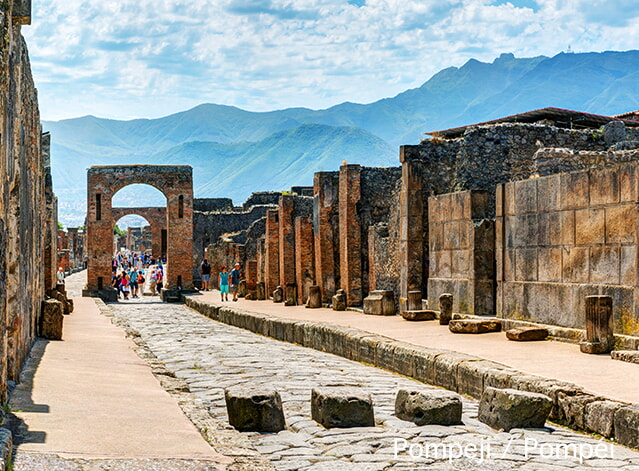 Temps libre ou exc. fac. à Pompéi, la ville ensevelie sous les cendres du Vésuve en 79 a. J.-C.– l‘une des villes antiques les mieux conservées. Une visite du musée et découverte de l’art ancestral des pâtes à Gragnano incl.
