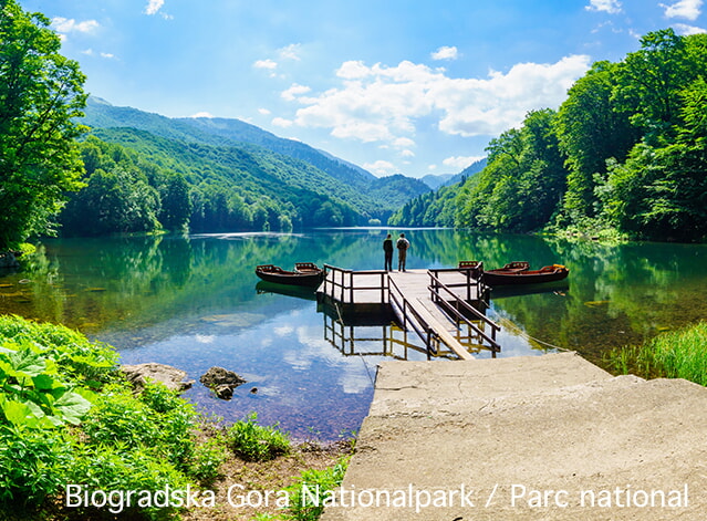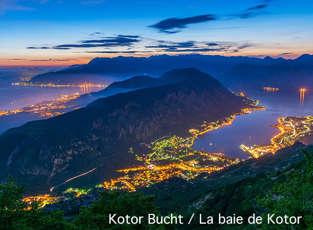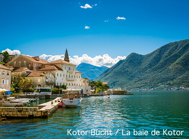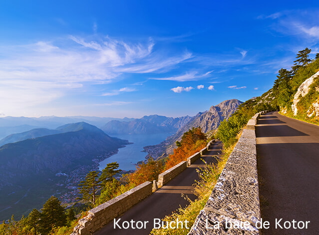 Le Monténégro impressionne par sa diversité sur un petit territoire. À l’intérieur des terres, le paysage est caractérisé par de hautes montagnes, des gorges profondes et des lacs limpides tels que les lacs Skadar et Biogradsko Jezero. Sur la côte Adriatique, l’histoire et l’art de vivre méditerranéen se rencontrent : les villes anciennes de Budva et Kotor, les ruines de Stari Bar, la ville historique de Cetinje et la ville moderne de Porto Montenegro à Tivat comptent parmi les points forts du pays.