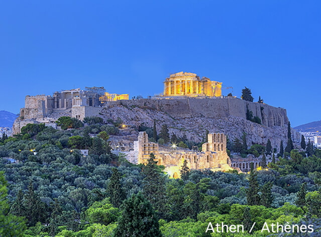 Tour de la ville d‘Athènes avec ses points forts uniques tels que le stade Panathinaiko et vue sur le grandiose temple de Zeus, chefs-d‘oeuvre de l‘architecture antique. Vous admirez la célèbre Acropole qui trône fièrement au-dessus de la ville et flânez dans les ruelles colorées et sinueuses de Plaka – l‘un des quartiers les plus anciens et les plus charmants d‘Athènes. Après-midi libre et dîner d‘adieu dans une taverne conviviale.