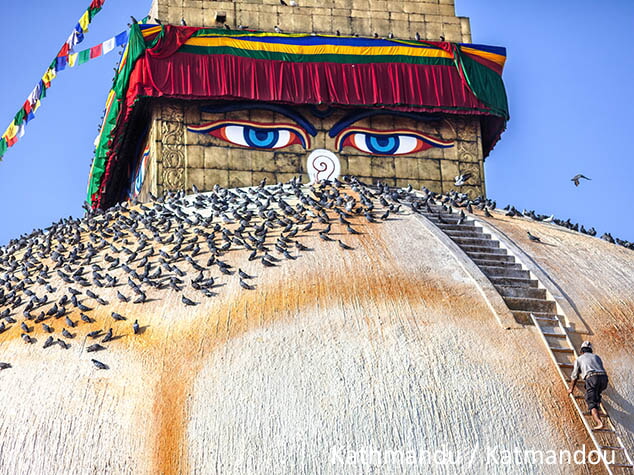Beeindruckend geht es weiter mit dem Besuch der faszinierenden, weiss-goldenen Bodhnath-Stupa – eine der grössten buddhistischen Stupas der Welt. Auch als «Klein-Tibet» bezeichnet, ist Bodhnath – neben Swayambunath – das wichtigste buddhistische Heiligtum im Kathmandu-Tal. Seit Jahrhunderten Anziehungspunkt buddhistischer Pilger aus Nepal und den umliegenden Regionen des Himalaya ist das Heiligtum ein magischer Kraftort. Die vier forschenden Augen des Buddha blicken in alle Himmelsrichtungen und der Turm symbolisiert die 13 Stufen ins Nirwana.