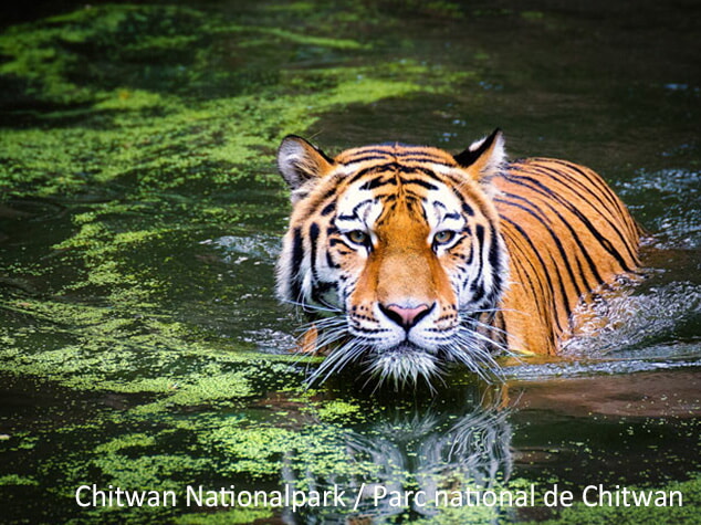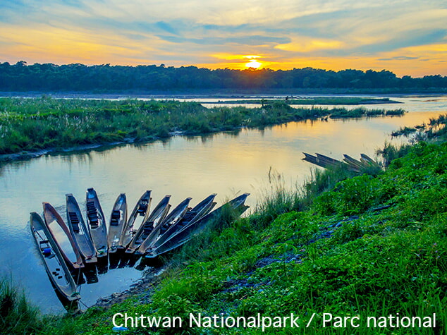 Auf zum Naturschutzgebiet des Chitwan Nationalparks – ein Weltnaturerbe der UNESCO. Der Chitwan National Park liegt in der subtropischen Tiefebene Nepals und bildet eine natürliche Grenze zum Nachbarland Indien. Es ist ein weitgehend unberührtes Gebiet mit grünen und savannenartigen Ebenen und üppigem Urwald.